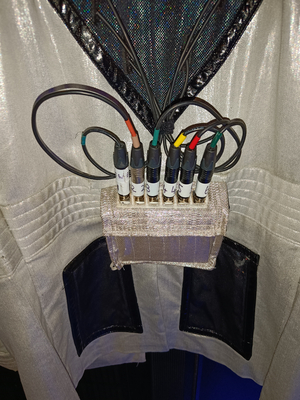 The problem is, those bass guitar strings don’t exactly make a nice, in tune sound when played with a bow and there’s no drums actually mounted in the jacket. Instead, these sounds come from a computer at the sound desk in the back of the theatre. I was tasked with designing a system that could send information about which “notes” are being played on the two wearable instruments to that computer, which would then play the appropriate sound. Since they would be played live in front of an audience, the requirements I identified were as follows: