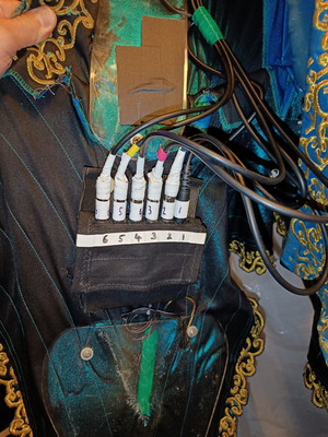 Modern theatrical productions are complicated, well-oiled machines. They feature all kinds of cool tech. In this production, certain members of the cast wore “wearable instruments” which they could play live on stage. One “instrument” was a dress which contained violin “strings” (actually bass guitar strings) which could be played with a Cello bow. The other was a jacket with pads on it which, when struck, would play a drum sound. The “drummer” could then pat the jacket like he was checking his pockets.