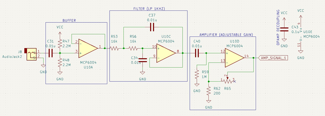 The first stage is a high impedance buffer – this is only there to present a high impedance input to the guitar pickup, since it can’t supply any signal power to a low impedance input. The second stage is a 2nd order Sallen-Key low-pass filter with a cutoff frequency of 1kHz. I chose this frequency to filter out all of the higher frequency noise coming from the many noise sources in a theatre. The third stage is an adjustable gain non-inverting amplifier. By adjusting a potentiometer, the sensitivity of this circuit can be set from A = 1 to A = 100,000.